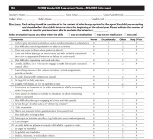The teacher version of the VADRS include 43 questions with 5 subscales and focuses on the child’s behavior in academic settings. Teachers rate behaviors on the same four-point scale, with a score of 1 or 2 on any performance-related items indicating potential impairment. The scoring criteria for the subscales is similar to the parent one: